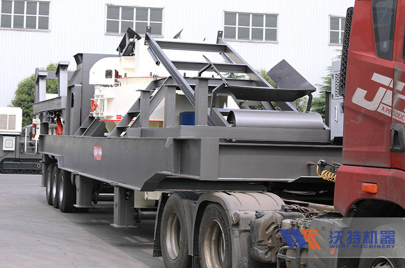 移动制砂机是把冲击破和振动筛等设备固定安装在车载系统上,整个车体可由牵引车拉走,到生产现场后不用固定安装,机器伸展开就可以直接生产了,灵活度高,方便更换生产场地。